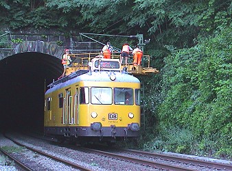 Äste verursachen Kurzschluss in der Oberleitung (Foto:Richter)(hr) Gestern Nachmittag kam es auf der Bahnlinie Eberbach - Heidelberg unmittelbar am östlichen Portal des Feuerberg-Tunnels zu einem Kurzschluss in der Oberleitung. Durch Funken entstand ein kleiner Brand an der bergseitigen Bahnböschung, der aber durch die Freiwillige Feuerwehr Hirschhorn rasch gelöscht werden konnte.