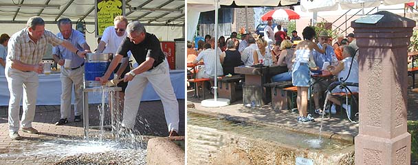 Das Bier floss in Strömen Das Bier floss beim misslungenen Fassanstich beim 20. Weisbacher Brunnerfest in Strömen. Unser Foto zeigt dabei v.l. Ortsvorsteher Reinhard Kessler, Altbürgermeister Gerhard Hauck, stellv. Bürgermeister Heinz-Dieter Ihrig und Bürgermeister Klaus Schölch. Das rechte Foto entstand auf dem Festplatz am Weisbacher Brunnen. (Fotos:Baumgartner)(tb) Wieder einmal von der Sonne verwöhnt wurde das Weisbacher Brunnenfest an diesem Wochenende. Nachdem die Jugend schon freitags den inoffiziellen Startschuss mit der 2. Weisbacher Scheunenparty feierte, eröffnete man gestern dann das 20. Brunnenfest mit dem offiziellen Fassanstich. Ingesamt hat man aus den Erlösen vom Brunnenfest rund 35.000 Euro für die Gestaltung des Bürgerhauses erwirtschaften können. Zwei durchgeführte Tombolas hätten für die neue Einsegnungshalle und das Bürgerhaus jeweils noch einmal 4.000 Euro eingebracht.