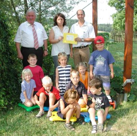 Spende von 200 Euro für den Kindergarten Haag Architekt Bernhard Ulmrich, Kindergartenleiterin Sigrid Nothdurft und Bürgermeister Roland Schilling mit Kindern des KiGa Haag (Foto:GV Schönbrunn)