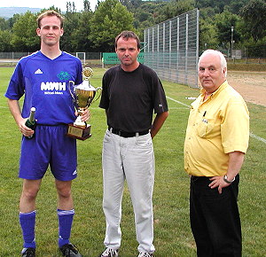 Sieg im Elfmeterschiessen – SVE und SGR in Vorrunde gescheitert Pokalübergabe durch den VfB-Vorsitzenden Joachim Scheible (m.) und Horst Schramm an den Spielführer der siegreichen Mannschaft aus Helmstadt. (Foto:Claussen)