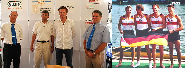 (jc) Einen standesgemäßen Empfang bereitete die Rudergesellschaft Eberbach ihrem frischgebackenen Vize-Weltmeister Axel Mayer und seinem Trainer Frank Günder am heutigen Abend auf der Terrasse des Bootshauses. Am vergangenen Wochenende hatte Mayer im Vierer ohne Steuermann mit seinen Mitstreitern Andreas Penkner (Radolfzell), Gregor Hauffe (Frankfurt) und Toni Seifert (Leverkusen) im Boot des Deutschen Ruderverbandes bei der U-23 Weltmeisterschaft in Belgrad die Silbermedaille gewonnen. Während man in einem hochklassig besetzten Feld unter 15 Nationen Vorlauf und Halbfinale gewinnen konnte, lag der deutscher Vierer, neben dem rumänischen Boot als Favorit gehandelt, nach 1500 Metern nur an vierter Stelle. In einem großen Schlussspurt waren es im Ziel eben nur noch diese Rumänen, die um eine Bootslänge schneller waren.