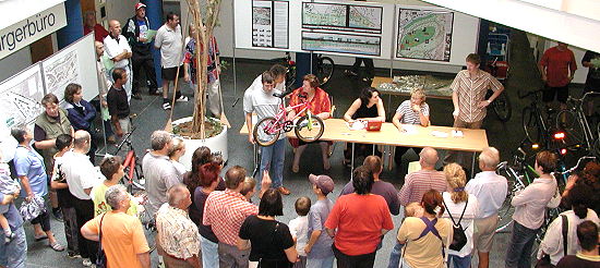 Fundfahrräder kamen unter den Hammer (Fotos:Claussen)(jc) Reges Interesse fand die heutige Versteigerung von Fundfahrrädern im Foyer des Rathauses. Mit schmalem Geldbeutel war das eine oder andere Schnäppchen zu ergattern. Insgesamt 17 Fahrräder kamen unter den Hammer, dabei waren je nach Zustand und Ausstattung Startgebote zwischen 50 Cent und 12 Euro angesetzt. Für ein gut erhaltenes Mountainbike mit dem Startpreis von sieben Euro waren letztlich beispielsweise 25 Euro, und für ein Kinderfahrrad mit dem Startpreis von einem Euro waren beim Zuschlag 9 Euro an "Auktionator" Alexej Schulz zu entrichten.