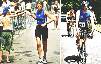 Eberbacher Triathleten beim 21. Allgäu Triathlon Stefanie Seib bei der Verpflegungsaufnahme und Boris Müller auf dem Rad (Fotos:privat)