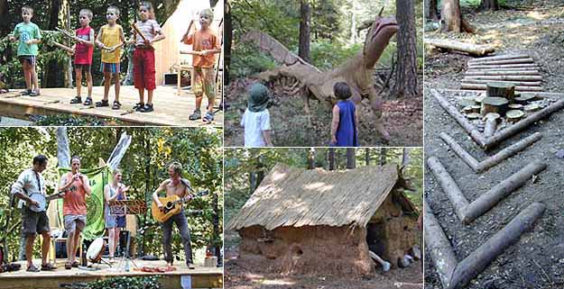 Veranstaltungen wurden begeistert angenommen Unsere Fotos zeigen links oben "Waldkinder machen Musik", unten die Irish-Folk-Band Fleadh, die die Zuhörer beim Abschlusskonzert begeisterte. In der Bildmitte bestaunen Kinder den Walddinosaurier. Auch das Lehmhaus, das Brigitte Zimmermann und Vera Arnold bauten mit dem natürlichen Baustoff Lehm, Holz und Stroh zusammen mit Autisten, hyperaktiven und mongoloiden Kindern, sowie Kindergartenkinder bauten, war ein Blickfang. Von allen Besuchern wurde der Sinnespfad (rechts) von Tonja Streblow gelobt, der zum Barfußgehen einlud.