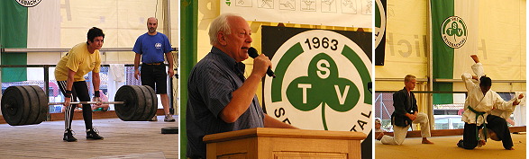 Abwechslungsreiche Sportschau mit Welt- und Europameistern Anita Timm "zog" 150kg, Horst Schnur überbrachte die Grüße des Odenwaldkreises und Kampfsportdemonstration (Fotos:Claussen)(jc) Im Rahmen des 40-jährigen Vereinsjubiläums des TSV Sensbachtal stand am heutigen Abschlusstag eine große Sportschau auf dem Progamm. Im Beisein von Landrat Horst Schnur und dem Vorsitzenden des Sportkreises, Wolfgang Schmucker waren zahlreiche unterhaltsame Programmpunkte im Festzelt zu bestaunen. Zu den Höhepunkten zählten die Auftritte von Gewichtheber Oliver Caruso, dem mehrfachem Welt- und Europameister aus Obrigheim und der amtierende Weltmeisterin im Frauen-Kraft-Dreikampf, Anita Timm.