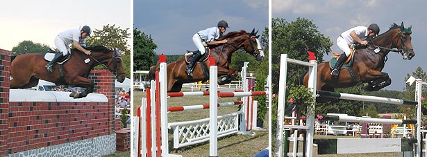 Drei Tage hochklassiger Pferdesport in Oberdielbach Die Fotos zeigen Szenen aus einem M-Springen am Samstag. Das linke Bild zeigt mit Markus Dreher auf Dragon 26 einen der beiden Sieger des Mächtigkeitsspringens bei einer Mauerhöhe von 1,90 Metern. (Fotos: Baumgartner)(tb) Nachdem das Springturnier im letzten Jahr wegen der deutschen Meisterschaften in Mannheim ausfallen musste, fand nun an diesem Wochenende das über drei Tage andauernde große Reit- und Springturnier des RSC Pferdeland Waldbrunn statt, bei dem über 1150 Meldungen einen neuen fabelhaften Teilnehmerrekord für das Pferdeland bedeuteten.