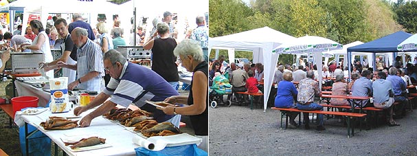 (tb) Zum 20. Seefest rund um den Katzenbuckelsee lud heute der Sportangelverein Katzenbuckelsee und die DLRG-Ortsgruppe Waldbrunn die Bevölkerung Waldbrunns und der näheren Umgebung ein. Herrliches Sommerwetter bei moderaten Temperaturen war in diesem Jahr dem Fest einmal wieder beschieden. So freuten sich die Veranstalter, dass schon zum Start des Seefestes nach den Gottesdiensten sich die Bankreihen bis gegen Mittag auf dem zum Festplatz umfunktionierten Parkplatz am Katzenbuckelsee bis fast auf den sprichwörtlichen letzten Platz füllten. Glück hatte hier, wer rechtzeitig kam und einen Sitzplatz ergattern konnte. Reißenden Absatz bei dem Seefest, welches aus dem Waldbrunner Veranstaltungskalender nicht mehr wegzudenken ist, fanden die über Waldbrunns Grenzen hinaus bekannten guten fangfrischen Forellen, die gebacken oder geräuchert angeboten wurden. Rund 550 Stück hatten die Veranstalter in diesem Jahr wieder vorbreitet und innerhalb kurzer Zeit verkauft. Natürlich gab es auch andere Speisen, so dass jeder auf seine Kosten kam. Zum Nachtisch konnte man sich dann ein Stück Kuchen gönnen, während die Kinder sich in der aufgebauten Hüpfburg austoben konnten. Zusätzlich wurden noch Schlauchbootfahrten auf dem Katzenbuckelsee an.