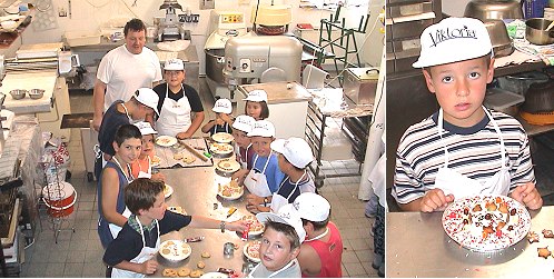 Zwergenbackstube im Viktoria-Café (Fotos:C.Richter)(hr) (cr) Im Rahmen des Eberbacher Ferienprogramms durften gestern 28 Jungen und Mädchen die Viktoria-Backstube in der Bussemerstraße erobern. Nach einem kleinen Imbiss im Cafe Viktoria gingen die Kinder bemützt und beschürzt an die Arbeit: Der Teig musste geknetet und ausgestochen werden, nach dem Backen der "Garnitur" konnte jedes Kind sein eigenes Cremetörtchen zaubern. Chefin Birgit Valerius und Backstubenleiter Martin Beigel sorgten mit drei weiteren MitarbeiterInnen dafür, dass alle Zutaten vorhanden waren und jeder ein Wunderwerk mit nach Hause nehmen konnte. Bevor die Kinder mit einem Eis verabschiedet wurden, durften sie noch das Kühlhaus und den Froster besichtigen.
