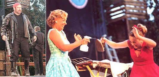 Nochmals Oper, Operette und Konzerte bei den Schlossfestspielen Zwingenberg Szenen aus Sabine Bodes diesjähriger "Freischütz"-Inszenierung: Der starke Kaspar (Brian McIntosh) zieht Max in seinen Bann, Ännchen (Janice Creswell, rechts) und Agathe (Kerrie Sheppard) singen nicht nur schöne Duette, sondern sie dürfen sich beim Bügeln des Hochzeitskleids auch eine erfrischende Wasserschlacht liefern. (Fotos:Schlossfestspiele)(hr) Noch einmal schießt der Freischütz, tanzt Olympia und lacht der Bettelstudent: Bei den Schlossfestspielen in Zwingenberg werden zwischen heute und Sonntag, 24.August, alle drei Opern- und Operetten-Produktionen der Saison ein letztes Mal zu sehen sein. Zudem gibt es das Nachtkonzert mit Franz Mazura, den Kindernachmittag und das Abschlusskonzert.