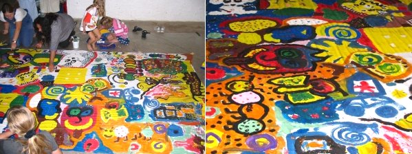 Eine kleine Geschichte über Einschlafprobleme und ihre wundersame Auflösung. Nach der Erzählung durften die Kinder nun ihre Eindrücke und Ideen zu Papier bringen. Juliane Kehm von der Galerie Artgerecht lieferte hierzu das nötige Material. So wurde ein riesiger Bogen Papier ausgelegt und die kleinen Künstler durften mit Tempera-Farben und Pinseln in allen Größen ihrer Phantasie freien Lauf lassen. So entstanden am Ende des Nachmittags zwei wunderschöne "Riesenbilder".
