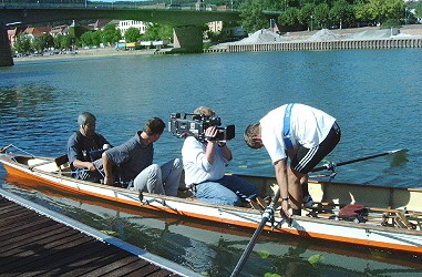 Der Dreh vom Ruderboot aus gestaltete sich dann nicht ganz einfach, obwohl die RGE ihr stabilstes und sicherstes Boot dabei einsetzte. In Frank Günder, Bootsbauingenieur bei Empacher und RGE-Trainer, hatten die Fernsehleute nicht nur einen kompetenten Gesprächspartner sondern auch einen erfahrenen Bootsobmann, der sie und ihre teure Ausrüstung sicher über die Wellen schaukelte. Wesentlich einfacher ließen sich die Szenen dann vom Motorboot aus einfangen, als Skuller in schnittigen Rennbooten gefilmt wurden. Dreharbeiten sind sehr zeitaufwändig. Für die Drei-Minuten-Reportage, die dann in der Sendung zu sehen sein wird, benötigten die Fernsehleute an die vier Stunden, und das bei Temperaturen über 30 Grad.