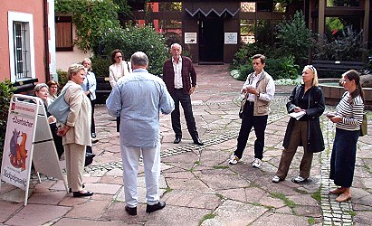 Journalisten aus Finnland besuchten bezaubernde kleine Städte in Baden-Württemberg (Foto:privat)(bro) (jm) Am vergangenen Freitag, 29. August, konnte eine Delegation finnischer Journalisten in Eberbach begrüßt werden. Die DZT - Sonderreise (Deutsche Zentrale für Tourismus) stand unter dem Thema "Lebensfreude und kulinarische Genüsse in bezaubernden Städten Baden-Württembergs". Eberbach wurde hierzu neben Heidelberg, Bad Wimpfen und Ludwigsburg aus dem Sonderkatalog der DZT "bezaubernde kleine Städte Deutschlands" ausgewählt. Nach einem ausführlichen Rundgang durch die Altstadt mit Stadtführer Eugen Emmig und einer kulinarischen Kostprobe im Café Viktoria konnte sich die Gruppe auf einen spannenden Vortrag im Küfereimuseum durch die Familie Helm freuen. Natürlich wurde auch hier gleich ein guter Tropfen aus dem Eberbacher Weinbrunnen angeboten. Das Küferei-Handwerk mit seinen vielen Fachausdrücken wurde von Frau Marjaana Saurila ( DZT Helsinki) direkt ins Finnische übersetzt, ansonsten belief sich die Kommunikation ausschließlich im Englischen. Ein traditioneller Mittagstisch mit regionalen Spezialitäten wurde anschließend im Hotel Karpfen serviert. Gesättigt mit Informationen und kulinarischen Köstlichkeiten konnte Julienne Matthias die Gruppe am späten Nachmittag verabschieden - nächste Station im Neckartal war Bad Wimpfen.