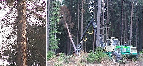 Borkenkäfer machen sich in Eberbachs Wäldern breit Links eine befallene Fichte, rechts eine Holzerntemaschine bei der Fällung. (Fotos:Richter)(hr) Die Waldbesitzer und Forstleute in Eberbach und Umgebung haben derzeit mit dem massiven Auftreten des Borkenkäfers zu kämpfen.