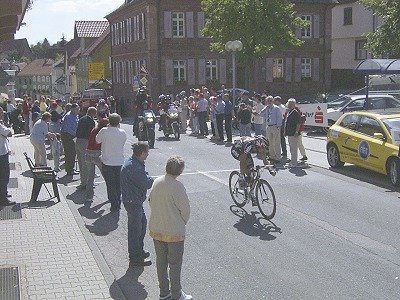 Bergwertung am Bürgerhaus in Beerfelden Der Franzose Frederic Gabriel vom Team MBK Oktos bei der Zeitnahme am Bürgerhaus in Beerfelden. (Foto:privat)(tw) (kj)Die erste Etappe der Hessenrundfahrt 2003 wurde am 3. September in Frankfurt gestartet. Die 177 km lange Etappe führte durch den Odenwald, kam durch Beerfelden und endete in Griesheim. 126 Rad-Profis nutzen die Hessen-Rundfahrt als Vorbereitung auf die Weltmeisterschaft. Das Team Gerolsteiner schickt den österreichischen Sprinter René Hasselbach, Team Telekom 2003, Daniele Nardello aus Italien ins Rennen. Für das Team Gerolsteiner war zudem Vorjahressieger Uwe Peschel mit dabei. Team Telekom war mit Lokalmatador Kai Hundertmarck, Daniele Nardello (dem Gewinner von Züri-Metzgete), Matthias Kessler und Andreas Klöden prominent besetz. Die beiden Telekom-Asse Winokurow und Salvodelli hatten aber kurzfristig abgesagt. Die Durchfahrt der Spitze wurde in der "Stadt am Berge" gegen 14.09 Uhr erwartet, wo am Bürgerhaus eine Bergwertung anstand, und pünktlich traf die Spitze des Feldes hier ein. 18 Fahrer hatten sich von Hauptfeld bereits abgesetzt und bis Beerfelden einen Vorsprung von 5 Minuten herausgefahren. Die Bergwertung in Beerfelden entschied der Franzose Frederic Gabriel vom Team MBK Oktos für sich (unser Foto). Auf den Plätzen zwei und drei folgten die beiden belgischen Fahrer Axel Merckx und Christophe Brandt aus dem Team Lotto-Domo. Die beiden Esten hatten so auch die erste Bergwertung in Hassenroth für sich entschieden. Die Spitzengruppe hatte sich dann auf 20 Fahrer vergrößert, fiel aber, nachdem sich Axel Merckx mit den beiden Franzosen Hary Maryan vom Team Brioches la Boulangere und der Cedric Vasseur vom Team Cofidis absetzen konnte, auseinander. Beim Zielspurt in Griesheim setzte sich vor 2000 Zuschauern Cédric Vasseur durch, knapp dahinter fuhr Hary Maryan über die Linie; ebenfalls noch zeitgleich nach 4:08:15 Stunden kam der Belgier Axel Merckx an. Bester deutscher Fahrer war Björn Glasner vom Team Lamonta mit 46 Sekunden Rückstand auf den Sieger. Das Hauptfeld kam mit 28:31 Minuten Rückstand ins Ziel. Bei der ersten Etappe gewann Frédéric Gabriel drei Bergwertungen, die vierte ging an Axel Merckx und Cédric Vasseur ist nicht nur Träger des Gelben Trikots sondern bislang auch bester Sprinter. Trotz des gemäßigten Tempos im Hauptfeld erreichten neun Fahrer Griesheim nicht. Unter anderen vier "Profis" der so genannten amerikanischen Nationalmannschaft. Damit starteten bei der zweiten Etappe nur noch 117. Die Hessenrundfahrt endet am Sonntag, 7. September, gegen 16.15 Uhr, nach rund 900 km in Wiesbaden.
