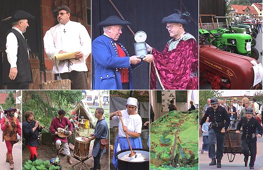 Sensbachtal blickt zurück auf vergangene Jahrhunderte Oben links die Darstellung des Ortsverkaufs durch die Theater AG, daneben Landrat Horst Schnur (l.) und Bürgermeister Manfred Heiss, Szenen des historischen Markts. (Fotos:Richter)(hr) Sensbachtal feiert an diesem Wochenende das Ortsjubiläum mit einem historischen Markt. Der Verkauf der Leute von "Senczelsbach" am 16.Oktober 1353 stellt die erstmalige urkundliche Erwähnung des Ortes dar. Passend zu dieser Jahreszahl donnerten heute pünktlich um 13.53 Uhr Böllerschüsse durchs Sensbachtal und leiteten den Jubiläumsmarkt rund um das Gemeindezentrum in Unter-Sensbach ein. Bürgermeister Manfred Heiss und Landrat Horst Schnur nahmen zur Eröffnung des Markts aufs 650-Jährige einen gemeinsamen Schluck aus dem großen Zinnbecher.