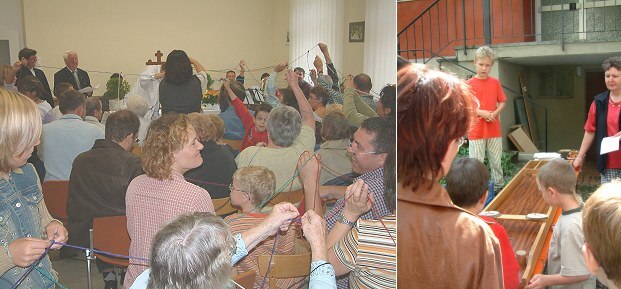 Regen tat der guten Stimmung keinen Abbruch Beim ökumenischen Gottesdienst wurde ein "Netz" geflochten. Kinder beim Spielangebot hinter dem Dorfgemeinschaftshaus. (Fotos:Wörner) (tw) Trotz des Regens nutzten heute Morgen doch einige Eberbacher den kostenlosen Busverkehr in den Ortsteil Gaimühle, um am Familienwandertag teilzunehmen. In einer oder zwei Stunden konnte man von dort aus auf verschiedenen Wegen nach Friedrichsdorf wandern. Geführt wurden die Gruppen von Mitgliedern des Heimat- und Verkehrsvereins aus Friedrichsdorf. Der an der Grillhütte in Friedrichsdorf geplante ökumenische Gottesdienst wurde wetterbedingt in das Dorfgemeinschaftshaus verlegt. Dort wurden die Wanderer anschließend auch vom Heimat- und Verkehrsverein bewirtet. Nach dem Essen konnte man den Mitgliedern des Spinnzirkels, der sich im Obergeschoss des Dorfgemeinschaftshauses eingerichtet hatte, bei der Arbeit an den Spinnrädern zusehen. Interessierte konnten sich die Wiesenbergquelle anschauen, von der auch Teile des Eberbacher Trinkwassers kommen. Für die Kinder gab es Ponyreiten, Spiel- und Bastelangebote. Um 15 und 16 Uhr konnte man mit dem Bus wieder nach Eberbach zurück fahren.