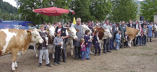 Fleckviehrinderschau mit Jungviehprämierung Die prämierten Tiere. (Foto:Gerbracht)(hr) Bei der traditionellen Fleckviehrinderschau mit Jungviehprämierung auf dem Eberbacher Kuckucksmarkt am vergangenen Dienstag waren 125 Tiere vertreten: 71 in der Katalogklasse 10 (Fleckvieh-Rinder) und 54 in der Katalogklasse 8 (Fleckvieh-Kalbinnen). Jungviehsieger wurde Friedhelm Kaiser aus Limbach/Balsbach, und beim Altvieh war Matthias Rechner aus Mudau/Reisenbach nicht zu schlagen. Die Bewertungskommission setzte sich aus Dieter Kraft, Rainer Föll und Reinhard Hagendorn vom Referat Tierzucht aus Ilshofen und Jochen Schmidt aus Kochendorf zusammen.