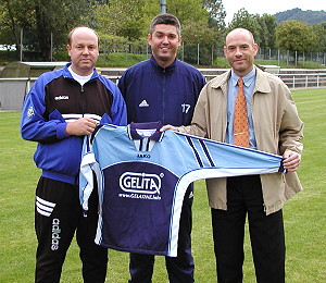 (jc) DGF Stoess sponsert für die D- Jugend des VfB Eberbach einen neuen Satz Trikots. Stephan Ruhm, zuständiger Abteilungsleiter für Sponsoring bei der DGF Stoess AG übergab heute in der Au einen Trikotsatz an Trainer Reinhard Wurm. Das Eberbacher Unternehmen, das sich seit einigen Jahren verstärkt im Sport- Sponsoring engagiert, und dabei Weltklasse- Athleten wie die Leichtathletin Heike Drechsler, den Gewichtheber Oliver Caruso oder die Triathleten Astrid Benöhr und Timo Bracht unter Vertrag hat, unterstreicht damit seinen Einsatz auch für den Nachwuchs- und Breitensport am Firmenstandort. Initiiert hatte die Trikotspende Firmenmitarbeiter und Vater eines der Nachwuchskicker, Jürgen Kumpf.