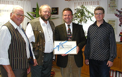 Neues Dienstleistungsunternehmen in Eberbach Vater Friedrich Müller, Günter Müller, Bernhard Martin und Sohn Benjamin Müller bei der Überreichung eines Geschenkes der Stadt Eberbach an den Firmengründer. (Foto:Claussen)