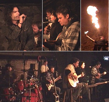 Akustischer Rock und feurige Einlagen "Steampowered Aeroplane" mit Gästen: oben links Rockröhre Paulo, rechts Gaukler Chris. (Fotos:Richter)(hr) Ein stimmungsvolles Open-Air-Event wurde den knapp 180 Besuchern gestern Abend im Innenhof am Pulverturm geboten. Die Eberbacher Band "Steampowered Aeroplane" gab sich auf Einladung des Kulturlabors ein Stelldichein und hatte einige Special Guests und Überraschungen mitgebracht.
