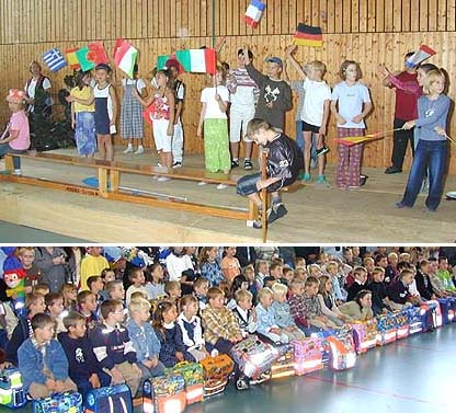 (tb) Ihren ersten Schultag erlebten am Samstag 59 ABC-Schützen in der Winterhauchschule Waldbrunn. Nach einem gemeinsamen Gottesdienst in der evangelischen Kirche ging es dann in die Schulturnhalle der Winterhauchschule. Hier begrüßte Rektor Karl Völker die neuen Schülerinnen und Schüler, die in der ersten Reihe sitzen durften. Spielen, singen, malen, sowie rechnen und schreiben lernen umschrieb Rektor Völker die kommende Zeit für die ABC-Schützen. Was man gemeinsam singen und spielen kann, bewiesen dann die drei dritten Klassen der Winterhauchschule mit Singspielen unter Anleitung ihrer Klassenlehrerinnen. Dass man dabei spielerisch auch mit aktuellen Themen umgehen konnte, zeigt die kleine Weltreise, bei der man Kinder verschiedener Nationalitäten mit ins Boot nahm. In diesem Jahr gibt es mit 59 Schülerinnen und Schüler nur noch zwei erste Klassen, nachdem man im letzten Jahr noch drei neue Klassen begrüßen konnte.