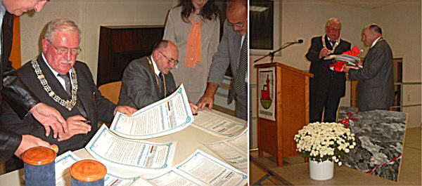 Die beiden Bürgermeister verlasen die Partnerschaftsurkunde in der jeweiligen Landessprache. Dann vollzogen sie den feierlichen Akt der Unterzeichnung und der Besiegelung, sekundiert vom Schönbrunner Ratschreiber und dem Notar aus Balatonszemes.