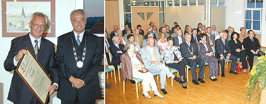 Waldbrunn zählt jetzt vier Ehrenbürger Im Rahmen einer Feierstunde wurde Gerd Mosca (links) von Bürgermeister Klaus Schölch zum vierten Ehrenbürger der Gemeinde Waldbrunn ernannt. Das rechte Bild zeigt die Gäste während der Feierstunde. (Foto: Baumgartner)(tb) Gestern wurde Gerd Mosca im Rahmen einer kleinen Feierstunde im Waldbrunner Rathaus die Ehrenbürgerschaft verliehen. Bürgermeister Klaus Schölch sagte dabei, dass dies eine Maßnahme sei, um an beispielhaftes Verhalten zu erinnern. Die Chronik der Gemeinde Waldbrunn verzeichne nur wenige Verleihungen des Ehrenbürgerrechts. Gerd Mosca reiht sich damit in die Reihe der bisherigen Ehrenbürger Fritz Schmidt, Pfarrer Franz Vester und Bürgermeister a.D. Gerhard Hauck ein. Bürgermeister Schölch würdigte den Werdegang Moscas, der 1966 die Firma Gerd Mosca mit einem Mitarbeiter in Hilden gründete. Nach Standorten in Eberbach und Zwingenberg sei die Firma 1982 nach Waldbrunn gekommen und habe dort stetig expandiert und Niederlassungen, u.a. in den USA, Kanada, Großbritannien, Australien, Spanien, Australien, Malaysia und Indonesien gegründet. Aus wirklich kleinsten Anfängen heraus habe Gerd Mosca ein Unternehmen von internationalem Rang mit über 600 Mitarbeitern, davon 440 in Waldbrunn, weltweit aufgebaut und zu wirtschaftlicher Blüte gebracht.