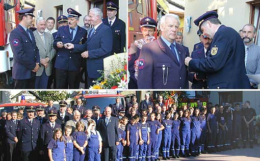 25-jähriges Jubiläum der Jugendfeuerwehr mit Ehrungen Die Neckargeracher Feuerwehr bekam gestern ein neues Löschfahrzeug. Unser Foto zeigt bei der Schlüsselübergabe von links Abt.Kommandant Uwe Gramlich, MdL Gerd Teßmer, Ges.Kommandant Trudbert Link, BM Peter Kirchesch, Kreisbrandmeister Rainer Dietz. Auch konnte Kreisbrandmeister Rainer Dietz Fritz Zweidinger mit dem silbernen Feuerwehrehrenkreuz auszeichnen. Das untere Bild zeigt die Feuerwehr und die Jugendfeuerwehr, die ihr 25-jähriges Jubiläum feiert, mit den Ehrengästen vor den Löschfahrzeugen. (Fotos:Baumgartner)