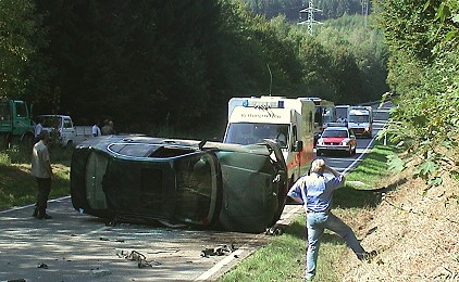 Drei Verletzte bei Schwanheim (Foto:Richter)(hr) Vermutlich aus Unachtsamkeit geriet ein 28-jähriger BMW-Fahrer aus Hirschhorn heute kurz nach 11 Uhr auf der Kreisstraße 4105 zwischen Schönbrunn und Schwanheim nach rechts auf den Grünstreifen. Das Auto begann zu schleudern, prallte dann in die linksseitige Straßenböschung und fiel auf die Seite. Der Fahrer sowie zwei weitere Autoinsassen verletzten sich dabei und mussten in die Kreiskrankenhäuser Eberbach und Sinsheim eingeliefert werden.