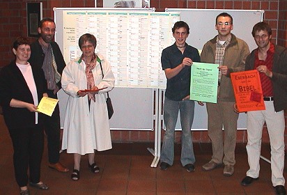 Eberbach liest die Bibel - rekordverdächtiges NonStop-Projekt geplant Das Vorbereitungsteam mit dem großen Ablaufplan für die Nonstop-Lesung: V.l. Magdalena Barth, Pfarrer Ekkehard Leytz, Ingrid Babel, Simeon Leytz, Sebastian Hepp und Stefan van Rensen. (Foto:Richter)(hr) Ein außergewöhnliches Projekt hat sich die Evangelische Gemeindejugend als Highlight im Jahr der Bibel ausgedacht: Von 26. bis 31. Oktober soll in einem Nonstop-Durchgang rund um die Uhr die Bibel von vorne bis hinten vorgelesen werden. Mitmachen an diesem "Eberbacher Bibel-Marathon" kann jeder. Das Vorbereitungsteam geht von 120 Stunden Gesamtlesedauer aus und will dazu rund 500 Lesende gewinnen. Hierzu kann man sich in einen großen Vorleseplan eintragen. Der Plan ist in 30-Minuten-Abschnitte unterteilt, und die zu lesenden Bibelstellen sind angegeben. Wer mitmachen will, kann sich also entweder seine Lieblingspassagen im "Buch der Bücher" zum Vorlesen herauspicken oder sich seinen bevorzugten Zeitraum wählen. Auch Gruppen, die sich einen Zeitraum intern nochmals aufteilen, sind willkommen. Neben dem Plan liegen Handzettel zum Mitnehmen aus, die Hinweise für die Lesungen enthalten und in denen man sich vermerken kann, wann man dran ist. Während des Bibel-Marathons liegen in der Michaelskirche verschiedene Bibeln sowohl zum Vor- als auch zum Mitlesen durch die Zuhörer aus. Eigene Bibel-Ausgaben können mitgebracht werden.