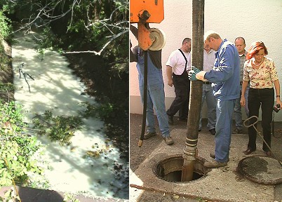 Milchige Brühe im Itterwasser (Fotos:Richter)(hr) Eine milchige Brühe ergoss sich heute gegen Mittag in den Itterkanal an der Gütschowstraße. Sie stammt vermutlich aus einer Altlast auf dem ABB-Gelände und wurde dort bei Bauarbeiten freigesetzt. Ob es sich um eine giftige Flüssigkeit handelt, müssen Proben erst noch ergeben. Nach ersten Maßnahmen durch die Freiwillige Feuerwehr Eberbach und der Stilllegung des Kanals durch einen Mitarbeiter des Itter-Kraftwerks begann ein Spezialunternehmen mit dem Abpumpen des verschmutzten Wassers. An der Einleitungsstelle verendeten einige Fische. Ein Fischsterben im größeren Umfang blieb allerdings aus.