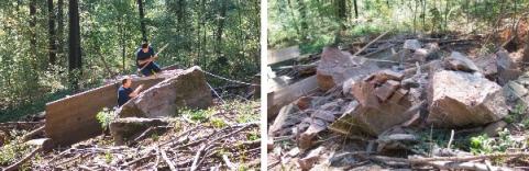 Große Sprengung durch das Technische Hilfswerk Eberbach Das Bild links zeigt die THW-Sprengmeister Mathias Hodbod und Alexander Knörtzer beim anzeichnen der Bohrlöcher. Das rechte Bild zeigt den zerlegten Felsen mit der Sicherung der Drahtmatte. (Foto:THW)(bm) Einen lauten Knall verursachte das Technische Hilfswerk gegen Mittag am vergangenen Samstag im Rahmen einer Sprengung am Itterberg. Die 1. Bergungsgruppe des THW Ortsverbandes Eberbach hatte am Montag zuvor bereits eine Schutzwand errichtet und den zu sprengenden Felsen mit Hilfe eines Drahtseils gegen Abrutschen gesichert. Am Sprengtag wurde zusätzlich unterhalb der Schutzwand ein Drahtnetz gespannt um evtl. durchschlagende Teile des Felsens aufzuhalten. Direkt unter den steilen Hang befinden sich zahlreiche Wohnhäuser, die durch den sehr unsicher liegenden Felsen in letzter Zeit stark gefährdet waren. Mit Hilfe eines von OV Neunkirchen mitgebrachten Kompressors und deren Bohnhammer wurden zunächst 6 Bohrungen in den Fels getrieben. 250g Sprengstoff wurden aufgeteilt und die Bohrungen anschließend verschlossen. Die Sprengberechtigten Mathias Hodbod vom OV Eberbach und Alexander Knörtzer vom OV Neunkirchen hatten die Durchführung gemeinsam geplant. Um halb eins betätigten sie nach dem sichern der Waldwege die Zündmaschine und die Ladungen zerlegten den Felsen in kleine Stücke. Die zwei Sprengberechtigten zeigten sich sehr erfreut über das Ergebnis. Auch die Schutzwand und das Netz hatten ganze Arbeit geleistet, keiner der Bruchstücke war ins Tal gerollt.