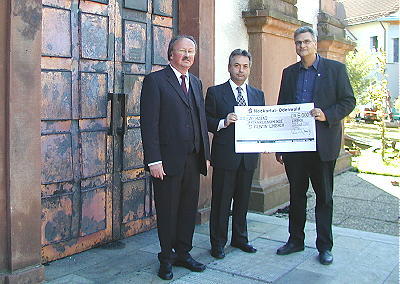 5.000 Euro für den Wiederaufbau der abgebrannten Limbacher Kirche (Foto:Sparkasse)(jc) (sno) Die katholische Kirchengemeinde St. Valentin wurde am Mittwoch, 17. September, als ihr Kirchengebäude bis auf die Grundmauern abbrannte, besonders hart getroffen. Das Ziel, ist den Wiederaufbau so schnell wie möglich voranzutreiben. Hierzu ist Geld, sehr viel Geld erforderlich, das aus vielen Quellen zusammengetragen werden muss. Zu den ersten Spendern gehörte die in der Region verankerte Sparkasse Neckartal-Odenwald. "Mit dieser Spende zeigen wir unsere Solidarität mit der Kirchengemeinde, versuchen ein Zeichen zu setzen und wollen die vorhandene Aufbruchstimmung unterstützen, um gemeinsam diese große Herausforderung meistern können", so der Vorstandsvorsitzende, Sparkassendirektor Gerhard Stock, bei der Übergabe an Pfarrer Karl-Michael Klotz im Beisein von Bereichsleiter Franz Mainz. Der Limbacher Seelsorger war sichtlich beeindruckt, bedankte sich für die großzügige Spende und sprach die Zuversicht aus, dass weitere Unterstützungsleistungen seitens der Bevölkerung über die Pfarrgrenzen hinaus folgen werden.