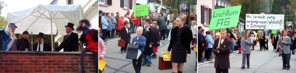 Unter fünf Bewerbern wurde Matthias Veith bei der Kerwe-Disc-Party zur Dorfschönheit auserkoren und erfüllt seine Aufgabe seit drei Tagen zur vollsten Zufriedenheit der Bevölkerung. Am Samstag ging das Kerwetreiben in den Allemühler Gaststätten weiter. Heute fand der traditionelle Kerweumzug statt. Ingesamt boten 15 Fußtruppen den zahlreichen Zuschauern einen bunten Festumzug. Die ausrichtende Musikkapelle Allemühl und die Neckargeracher Musikanten FWK heizten ein. Angeführt von Kerwepfarrer Ralph Schweizer und der Kerweschlumpel reihten sich die kreativen Kerweteams aneinander. Der Empfang der "Tour de Ländle" in Allemühl, die neue Kneipp- und Kuranlage des "Bad Allemühl" in der Bach hinter Konrad´s und der versehentlich rot lackierte Hund des Wagens von "Bulldog-Rot-Hund-in-Not" waren genauso sehenswert wie die lustigen "Gsichter" oder der Wagen der "Allemühler Television", auf dem "Talende" für den Wettbewerb "Allemühl sucht den SuperStar" gecastet wurden. Ein besonderes Bonbon bot die "Leuchtturm AG", die mit jungen Managern Schwung in die Wirtschaft bringen will und deshalb Aktien zum Nennwert von 50 Euro an die Kerwebesucher ausgab. Diese dürften damit sehr zufrieden sein, zumal der Allemühler Aktien Index, kurz "AAx" genannt, zur Zeit deutlich über den Dax-Werten liegt. Mit einem reichhaltig mit allerlei Getier ausgestatteten Kerwewagen erinnerte der "bärenstarke" BSC Allemühl an die kürzlich ausgerichtete Deutsche Meisterschaft.