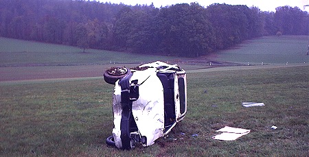 Auf nasser Fahrbahn die Kontrolle verloren und mehrfach überschlagen (Foto:A.Claussen)(jc) (ac) Auf der K 4105 zwischen Schönbrunn und Schwanheim ereignete sich heute gegen 12.30 Uhr ein schwerer Verkehrsunfall. Ein 19-jähriger Fahrer aus Schönbrunn verlor in einer langgezogenen Linkskurve in Fahrtrichtung Schwanheim durch nicht angepasste Geschwindigkeit die Gewalt über seinen Ford Fiesta. Er rutschte nach links von der Fahrbahn, riss einen Ahornbaum in zwei Teile und stürzte eine zwei Meter hohe Böschung hinunter. Nachdem er sich mehrfach überschlagen hatte, kam der Fiesta schließlich auf einer Wiese auf der Fahrerseite zum Liegen.