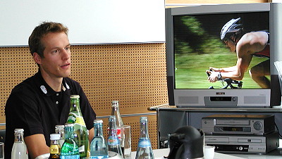 Timo Bracht peilt mit Unterstützung von DGF Stoess Weltspitze an Timo Bracht erläutert anhand eines Videos von seinem Ironman France-Wettkampf den persönlichen Ablauf einer solchen Veranstaltung. (Foto:Claussen)(jc) Übermorgen begibt sich der Top-Triathlet Timo Bracht auf den Weg zum prestigeträchtigsten Wettkampf in seiner Sportart, dem Ironman auf Hawaii, bei dem der Eberbacher am 18. Oktober zum dritten Mal starten wird.
