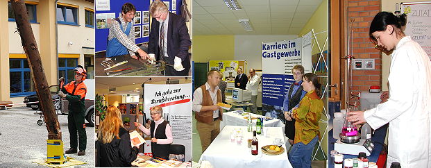 Ausbildungsplatzmesse der Hauptschule fand wieder großes Interesse Baumfällsimulator des Staatlichen Forstamtes (li.), Schulrat Fred Wingerter legt am Stand der Schlosserei Thomas Becker selbst Hand an (oben), sowie Infostände des Arbeitsamtes (unten), des Gaststättenverbandes und der Firma DGF Stoess AG (Fotos:Claussen)(jc) Heute fand in der Hauptschule mit Werkrealschule Eberbach zum zweiten Mal eine Ausbildungsplatzmesse statt. Wie im vergangenen Jahr waren wieder etwa 30 Betriebe und Dienstleistungsunternehmen bereit, ihre Ausbildungsfelder und Berufe vorzustellen. Die Veranstaltung war ein Projekt des "Runden Tisches", dessen Ziel es ist, gemeinsam mit Partnern aus der Wirtschafts- und Arbeitswelt die "Ausbildungsfähigkeit" der Schülerinnen und Schüler an der Hauptschule mit Werkrealschule zu steigern.