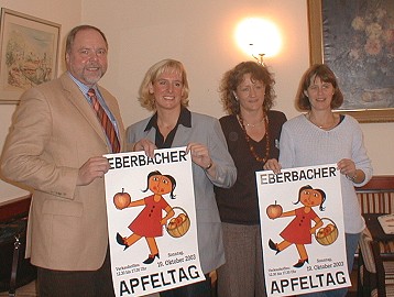 Apfeltag steht wieder vor der Tür Die EWG-Aktiven stellten das Programm zum Apfeltag vor: V.l. Dietrich Müller, Christine Uebing, Christa Wolff und Renate Lang-Wurm. (Foto:C.Richter)(hr) (cr) Am Sonntag, 19.Oktober, ist es wieder soweit: Der Eberbacher Apfeltag soll abermals Tausende Besucher aus Nah und Fern in die Neckarstadt locken. Auch in diesem Jahr hat die Eberbacher Werbegemeinschaft (EWG) für ein attraktives Programm gesorgt. Bereits am Samstagmittag, 18.Oktober, startet das Wochenende rund um den Apfel um 14 Uhr mit dem Spiel-Spaß für alle Kinder auf dem Lindenplatz. Jedes teilnehmende Kind erhält einen von den EWG-Mitgliedern gestifteten Preis. Der Erlös des Luftballonwettfliegens ist für einen wohltätigen Zweck bestimmt. Am Abend findet dann das kulturelle Highlight das Apfeltags statt: Der Odenwälder Shanty Chor wird auf Einladung des Kulturlabors mit seinem Programm "Der Herr der Heringe" im Großen Saal der Stadthalle für Stimmung sorgen.