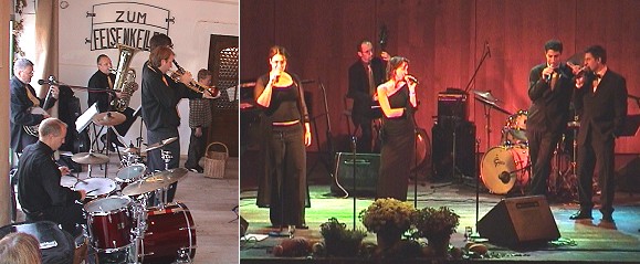 Jazz in Firmenräumen kam an Links die "Oldtime Jazz Connection" in Beerfelden, rechts "Salto Vocale" in der Stadthalle. (Fotos:Richter)(hr) Mit zwei unterschiedlich besuchten Veranstaltungen sind gestern die diesjährigen Eberbacher Jazztage zu Ende gegangen. Während es beim vormittäglichen Jazzfrühschoppen mit der "Oldtime Jazz Connection" im vollbesetzten urigen "Felsenkeller" der Brauerei Schmucker in Beerfelden eng zuging, hätte das Konzert mit "Salto Vocale" am Abend in der Stadthalle mehr Besucher vertragen können: Nur rund 50 Gäste lauschten den unterhaltsamen Songs des Quartetts mit Jazz-Trio im Großen Saal.