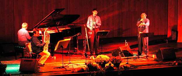 Auf anspruchsvoll jazziger Entdeckungsreise zu einer fremden Insel (Foto:Claussen)(jc) Im Rahmen der Reihe "JazzMe" des Kulturamtes gastierte am vergangenen Freitag das "Patrick Bebelaar Quartett" im Großen Saal der Stadthalle. Rund 50 Freunde anspruchsvoller Jazz-Klangformationen waren gekommen, um den Spannungsbogen so unterschiedlicher Instrumente wie tiefer Tuba und orientalisch verspieltem Sopransaxofon, modalem Horn oder jazzigem Piano zu erleben. Auf der Bühne standen neben dem Tübinger Pianisten auch der Träger des diesjährigen Jazz-Preises des Landes Baden-Württemberg, Frank Kroll (Sopransaxofon, Klarinette und Bassklarinette), SWF-Jazzpreisträger Herbert Joos (Flügelhorn, Trompete und Kornett) und der Franzose Michel Godard (Tuba). Er entlockte der in der Jazzszene eher selten bedienten Tuba gleich zu Beginn Klänge, die zwischen leichter Beklemmung und klingender Begeisterung zu wandern wussten. In der Folge ließ die Formation um den Landes-Jazz-Preisträger 2000 seine vielfach hochgelobte Komposition "You Never Loose An Island" erschallen und erntete für diese Suite, ebenso wie für das Gesamtkonzert, verdiente Begeisterung verbunden mit lang anhaltendem Applaus des Publikums.