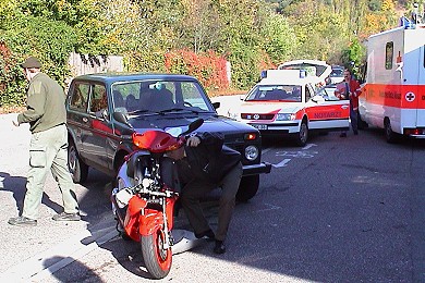 Vohrfahrt nicht eingeräumt - ein Schwerverletzter (Foto:Richter)(hr) Schwere Verletzungen erlitt der Fahrer eines Motorrollers heute gegen 14.30 Uhr bei einem Unfall auf der Wilhelm-Blos-Straße in Eberbach. Ein 21-jähriger Waldbrunner wollte mit seinem Lada-Geländewagen nach links zur dortigen Tankstelle einbiegen und übersah den entgegenkommenden Rollerfahrer. Der 32-jährige Eberbacher flog nach dem Crash über die Motorhaube des Autos auf den Gehweg. Notarzt und DRK versorgten den Verletzten, der stationär im Eberbacher Kreiskrankenhaus aufgenommen wurde. Den Sachschaden bezifferte die Polizei auf rund 5000 Euro.
