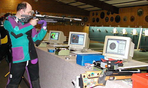 SSV Eberbach geht mit elektronischer Scheibenanlage in neue Saison (Foto:A.Claussen)(jc) (ac) Vorgestern fand im Eberbacher Schützenhaus die Vorstellung einer neuen elektronischen Scheibenanlage statt. Künftig wird dort, wie bereits seit zwei Jahren bei Deutschen Meisterschaften, per Schallmessung das Schussergebnis ermittelt und an einen zentralen Rechner zur Auswertung weitergeleitet. Der SSV Eberbach ist damit der erste Schützenverein im Schützenkreis Neckartal, der über ein solches System, bei dem das Durchschlagen der Scheibe mit Ultraschall erfasst und auf einem Monitor angezeigt wird, verfügt. Die Kosten der Anlage belaufen sich auf rund 25.000 Euro, die vom SSV Eberbach selbst finanziert wurden. Vom Badischen Sportbund wird noch mit einer nachträglichen Förderung gerechnet. Den ersten Härtetest in einem Kreisligavergleich der 3. Mannschaft des SSV mit Hirschhorn II (3:0) hat die neue Anlage erfolgreich bestanden.