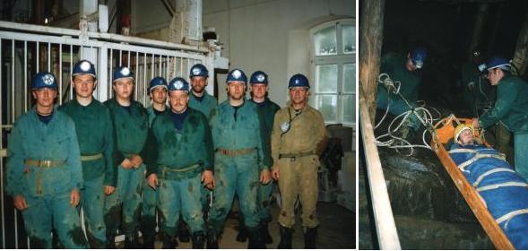 Technisches Hilfswerk übt Umgang mit unbekannten Situationen Das linke Bild zeigt die Führungskräfte nach der Ausfahrt am letzten Tag. Das rechte Bild den Transport des Verletzten in einem Schleifkorb über eine Fahrte (Leiter) zur nächsthöheren Sohle. (Foto:THW)(bm) (as) Die Führungskräfte des THW Ortsverbandes Eberbach nutzten das verlängerte Wochenende vom 3.Oktober bis 5.Oktober 2003 um sich fortzubilden. Durch den Ortsbeauftragten Ulrich Schaffer war in der Silberstadt Freiberg (Sachsen) in Zusammenarbeit mit der TU Bergakademie Freiberg ein Lehrgang für Studenten auf die Bedürfnisse des THW ausgerichtet worden. „Umgang mit unbekannten Situationen - Entwicklung der Persönlichkeitseigenschaften von Führungskräften“. Das ehemalige Silberbergwerk „Reiche Zeche“ wird seit 1969 nicht mehr befahren und dient heute als Besucher- und Lehrbergwerk.