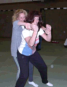 Bernd Grimm und Günter Frey, vom Polizeirevier Eberbach, leiten den Kurs und haben aus ihrem Repertoire als polizeiliche Einsatztrainer die eine oder andere effektive Technik im Programm, mit denen "eine Frau Grenzen setzen kann, wenn es darauf ankommt".