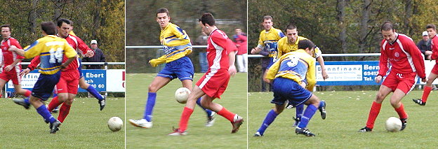 Spannendes Eberbacher Fußballderby (Fotos:Claussen)(jc) Keinen Sieger fand der sportliche Vergleich beider Eberbacher A- Ligisten heute vor rund 250 Fußballfreunden in der Au. Vor allem in der ersten Halbzeit sahen die Fans beider Lager ein schlechtes, überhart geführtes Derby, wobei der Schiedsrichter mit zunehmender Spieldauer immer mehr den Überblick verlor. Durch ein Eigentor geriet der SVE bereits nach acht Minuten in Rückstand. Weitere Chancen blieben vor dem Seitenwechsel von beiden Mannschaften ungenutzt. In der zweiten Halbzeit waren vier Minuten gespielt, da glich Attila Akcelik für den SVE zum 1:1 aus. Die Partie gewann nun vorübergehend an Tempo und bereits vier Minuten später schloss der VfB einen schönen Spielzug zur erneuten Führung ab. Weiterer Kombinationsfußball dieser Klasse blieb in der Folge aber wieder Mangelware. Nach einem Foul an Mathias Schuster im VfB- Strafraum entschied der Unparteiische auf Strafstoß, den Achim Hable unhaltbar verwandelte. Danach wollte der SVE die Entscheidung, der Druck führte jedoch, ebenso wie die Konter des Lokalrivalen zu keinem weiterem Treffer, somit trennten sich die Eberbacher in einem zeitweise schwachen, aber spannenden Derby mit einem leistungsgerechten 2:2, was zumindest dem VfB, der mit Trainer Christian Gries als Spieler aufgelaufen war, nicht weiterhalf. Das Team liegt jetzt mit zwei Zählern aus elf Spielen und fünf Punkten Rückstand auf ein Trio auf dem letzten Tabellenplatz der Kreisliga A. Der SV verbucht nun sieben Zähler und liegt punktgleich mitten in diesem Trio auf dem 14. Platz.