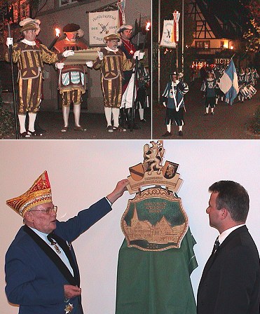 Grund des Spektakels war die offizielle Vorstellung eines Karnevalsordens - nicht irgendeines Ordens, sondern des Jahresordens der "Vereinigung der Badisch-Pfälzischen Karnevalsvereine e.V." für die kommende Kampagne 2003/2004. Die Dachorganisation der Badischen und Pfälzischen Narrenzünfte widmet den Orden alljährlich einer anderen Stadt. Im letzten Jahr war es Rastatt, jetzt ziert eine Ansicht des Eberbacher Lindenplatzes das närrische Geschmeide, das Günter Hauck, Präsident der Vereinigung, im Ratssaal vorstellte und an Bürgermeister Bernhard Martin als ersten Träger des neuen Ordens übergab.