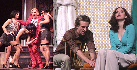 Landesbühne inszenierte Musical-Welterfolg Links die "Kit Kat Club Girls" mit ihrem Conférencier, rechts Wolf E. Rahlfs als Cliff Bradshaw mit Julia Goehrmann als Sally Bowles. (Fotos:Richter)(hr) Mit der Inszenierung des Musical-Welterfolgs "Cabaret" startete die Badische Landesbühne vorgestern in die neue Eberbacher Theatersaison. Gut 140 Zuschauer verfolgten die Liebesgeschichte zwischen dem mittellosen amerikanischen Schriftsteller Cliff Bradshaw (Wolf E. Rahlfs) und der Nachtklub-Sängerin Sally Bowles (Julia Goehrmann) in Berlin vor dem Hintergrund des heraufziehenden Nazi-Regimes.