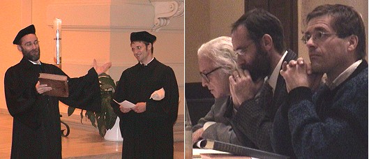 Bibel wurde zum Stadtgespräch Links Ekkehard Leytz und Stephan van Rensen alias Martin Luther und Philipp Melanchthon beim Abschlussgottesdienst. Rechts Karlheinz Mai, Ekkehard Leytz und Raimund Klingbeil (v.l.) beim Verlesen von Bibelstellen auf Lateinisch, Hebräisch und Altgriechisch. (Fotos:Richter)