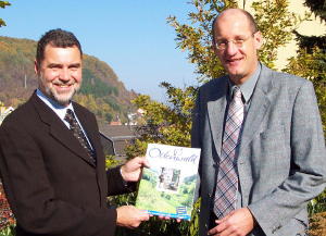 Neuer Katalog 2004 der Touristikgemeinschaft Odenwald liegt vor TGO-Geschäftsführer Hubert Falkenberger (rechts) bei der Überreichung des neuen Katalogs an Landrat Detlef Piepenburg.(Foto:TGO)