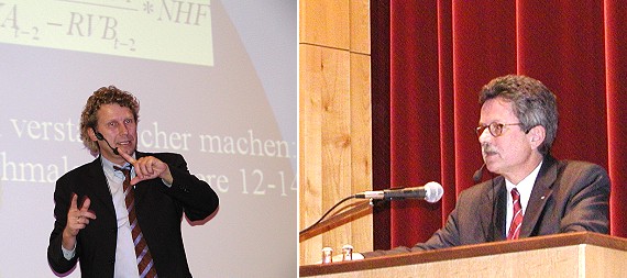Mittelstandsforum fokussierte die Zeitbombe Rentenversicherung Prof. Dr. Bernd Raffelhüschen (links) beim nicht ganz ernst gemeinten Versuch die Rentenformel näher zu bringen sowie Rainer Sauerwein. (Fotos: Claussen)